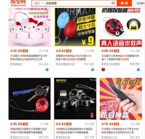 记者在淘宝上键入“防狼神器”一词,除了防狼喷雾、喷火防狼神器之外,销量在前几位的还有防狼戒指、强光手电等。除上述提到的具有一定攻击性的武器,如防狼喷雾、袖珍短棍、防狼笔等。记者注意到,网上出售的防狼工具,大多小巧便携,攻击性小,倾向于防护。