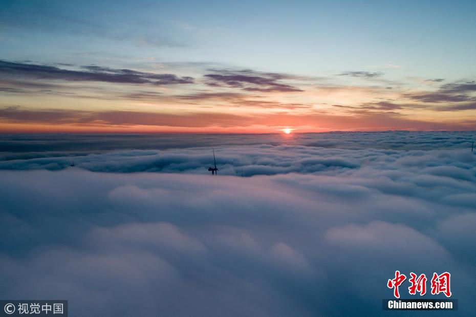 2018年9月29日,黑龙江鸡西中俄界湖兴凯湖北岸的蜂蜜山国家地质公园,山上的树林红黄绿相间,秋色渐入佳境,由于温差和温度适宜,加上南风助力,上演了一场秋色云海大片。图片来源:视觉中国
