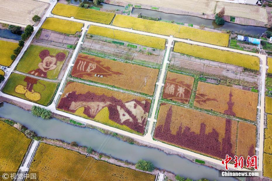 11月2日,上海浦东新区,川沙新镇,立冬将至,一幅由五色水稻组成的举行创意水稻画卷画面“定格”,水稻完全成熟开始被收割。据悉,这幅水稻画卷共200亩,一共有8个品种的水稻,呈现黑、红、黄、绿、白5种颜色,共同组成“川沙戏曲小镇、迪士尼乐园、改革开放四十周年”等元素的巨型水稻画,米老鼠活灵活现栩栩如生,古桥等图案采用水墨画的形式,“川沙、浦东”两个大字则用“小篆”字体,这些都是由川沙农民金忠华花了3个多月时间精心打造而成,其中,育苗环节就花了1个多月时间。沈春琛 摄 图片来源:视觉中国