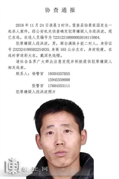 东北网11月26日讯 (记者 包海多) 11月24日3时许,绥化市望奎县某小区发生一起杀人案件,一男子将同居女子杀害后潜逃。经公安机关侦查确定犯罪嫌疑人为段洪波,男,厢白满族乡前二村人,身份证号:232324198502254835,身高165cm左右,身材较瘦,在逃时穿迷彩大衣,戴深色线帽。