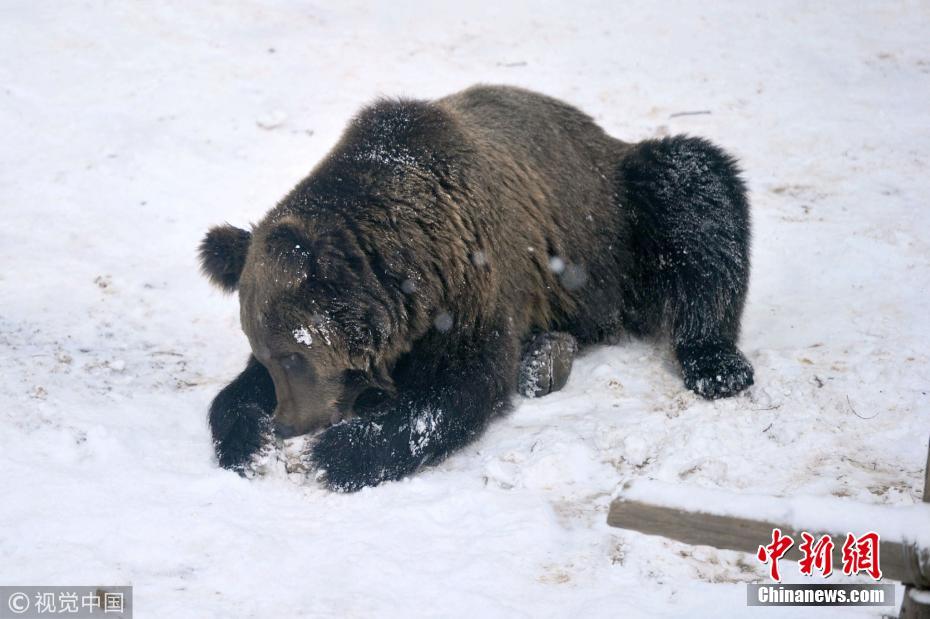 12月11日,山东青岛普降中雪。青岛森林野生动物世界熊池中棕熊熊大至熊五在雪地里玩耍,好久没见大雪的棕熊们非常兴奋。熊五不顾其他熊哥熊姐,独自抱住一根木棍在雪地里练起了棍棒技艺,犹如少林寺里的棍棒神僧,憨萌逗人。图片来源:视觉中国