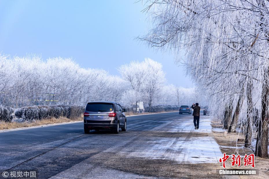 1月13日,107国道河北省定州路段出现雾凇(树挂)景观,吸引路人驻足拍照留念。王保生 摄 图片来源:视觉中国
