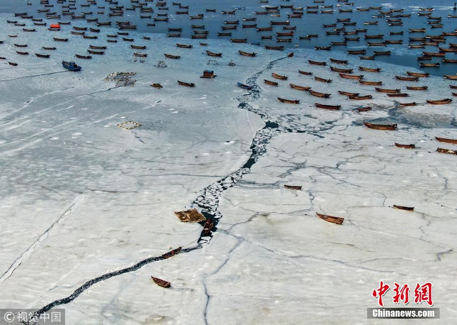 近日,大连,一位渔民在金石滩渔港破冰运送渔具。当日,大连遭寒流突袭,厚厚的海冰封住了金石滩港口,许多渔船被凝固在冰面上。为了不影响捕捞,勤劳的渔民们用小木船破冰开道,打开一条运输线,把网具运送往港外的养殖区。 图片来源:视觉中国