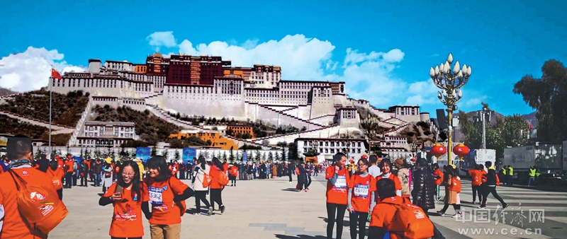 拉萨市举办的首届半程马拉松结束后,参赛选手在终点布达拉宫前合影留念。2018年,西藏全区接待国内外游客超3000万人次。 经济日报-中国经济网记者 代 玲摄