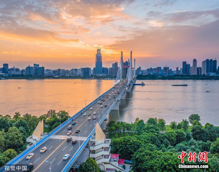 6月23日,夕阳西下,湖北武汉现绚丽晚霞,映红天空和江边。华灯初上,晚霞在武汉长江二桥上空映照下,整个城市更加绚烂多彩。赵广亮 摄 图片来源:视觉中国