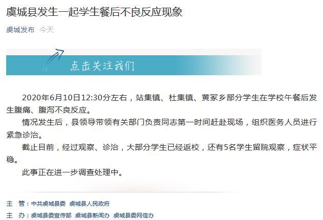 中新网6月10日电 据河南虞城县委宣传部官方微信消息,6月10日12时30分左右,虞城县站集镇、杜集镇、黄冢乡部分学生在学校午餐后发生腹痛、腹泻不良反应。