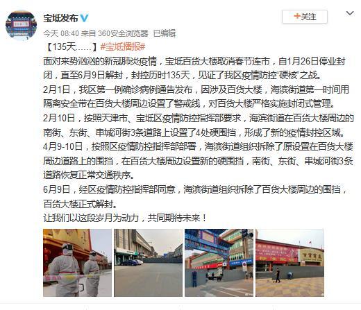 中新网6月10日电 据天津市宝坻区政府官方微博消息,6月9日,经天津市宝坻区疫情防控指挥部同意,宝坻区百货大楼正式解封。该百货大楼因涉及新冠肺炎确诊病例自1月26日停业封闭,直至6月9日解封,封控历时135天。