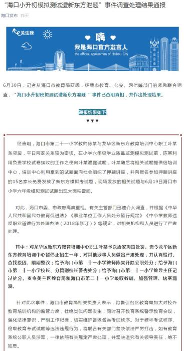 通报称,经海口市教育、公安、网信等部门的紧急联合调查,“海口小升初模拟测试遭新东方泄题 ”事件已查明真相,并作出处理结果。