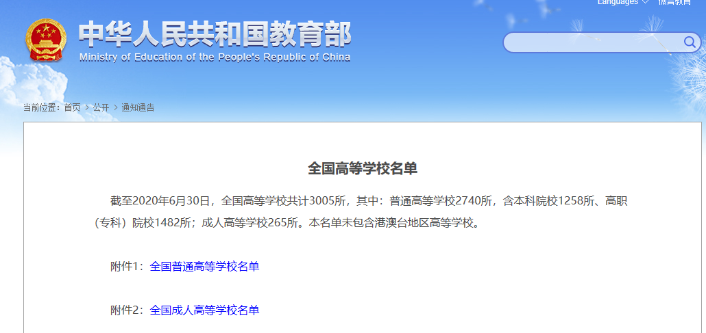 截至 2020 年 6 月 30 日,全国高等学校共计 3005 所,其中:普通高等学校 2740 所,含本科院校 1258 所、高职(专科)院校 1482 所;成人高等学校 265 所。本名单未包含港澳台地区高等学校。