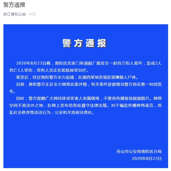 中新网8月23日电 据浙江舟山市公安局普陀区分局官方微信消息,2020年8月23日晚,浙江舟山普陀区沈家门街道船厂路发生一起持刀伤人案件,造成2人死亡1人受伤,受伤人员正在医院接受治疗。案发后,经过普陀警方全力追捕,在浦西某地发现犯罪嫌疑人尸体。