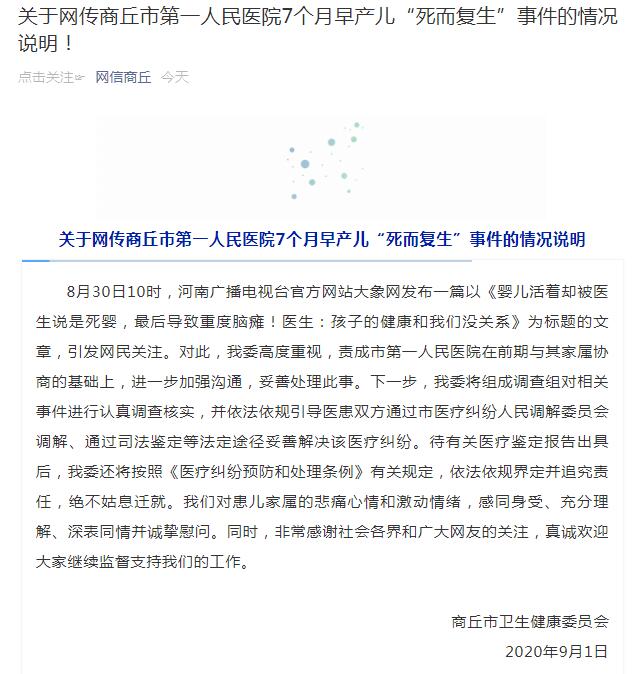 情况说明称,8月30日10时,河南广播电视台官方网站大象网发布一篇以《婴儿活着却被医生说是死婴,最后导致重度脑瘫!医生:孩子的健康和我们没关系》为标题的文章,引发网民关注。对此,商丘市卫健委高度重视,责成市第一人民医院在前期与其家属协商的基础上,进一步加强沟通,妥善处理此事。