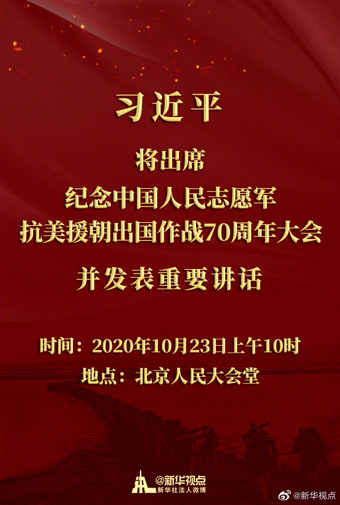 新华社北京10月21日电 纪念中国人民志愿军抗美援朝出国作战70周年大会将于23日上午10时在北京人民大会堂隆重举行。中共中央总书记、国家主席、中央军委主席习近平将出席大会并发表重要讲话。