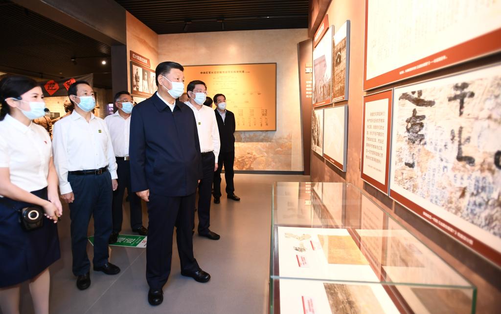 2020年9月16日,习近平在郴州市汝城县文明瑶族乡沙洲瑶族村“半条被子的温暖”专题陈列馆,了解当地开展红色教育情况。(新华社记者 谢环驰 摄)